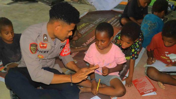 Suasana serupa juga terjadi di Aspol Polres Pegunungan Bintang, tepatnya di Kampung Distrik Oksibil, Kabupaten Pegunungan Bintang. Di tempat ini, para personel duduk lesehan bersama anak-anak, menyatu tanpa sekat, menciptakan ruang belajar yang penuh keakraban.